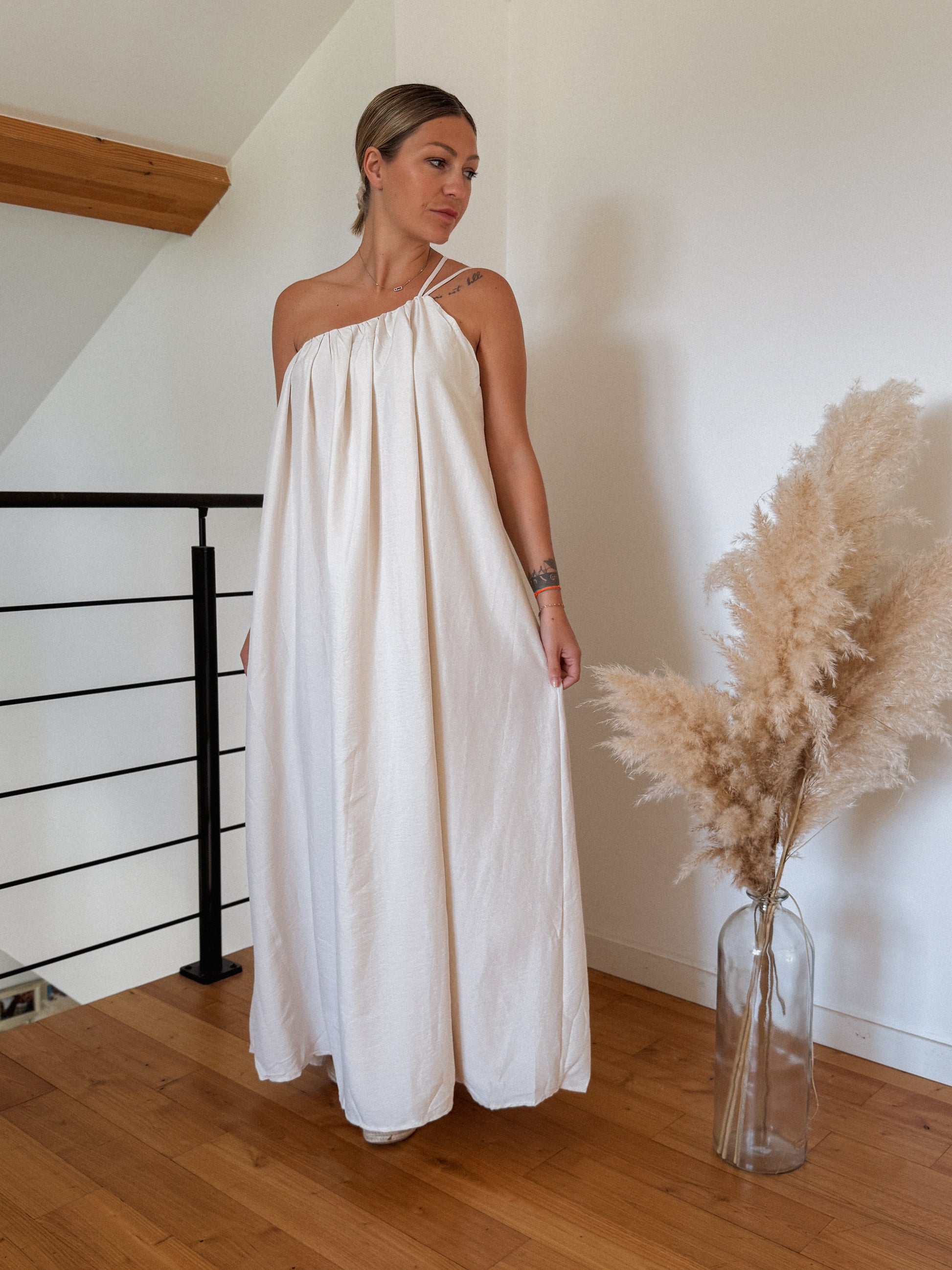 La robe Maë est une sublime robe longue de couleur blanc cassé. Son coté asymétrique se voudra tendance et très élégant. Elle sera parfaite pour tous types de journées. Elle se veut fluide et agréable à porter. Aucune transparence.