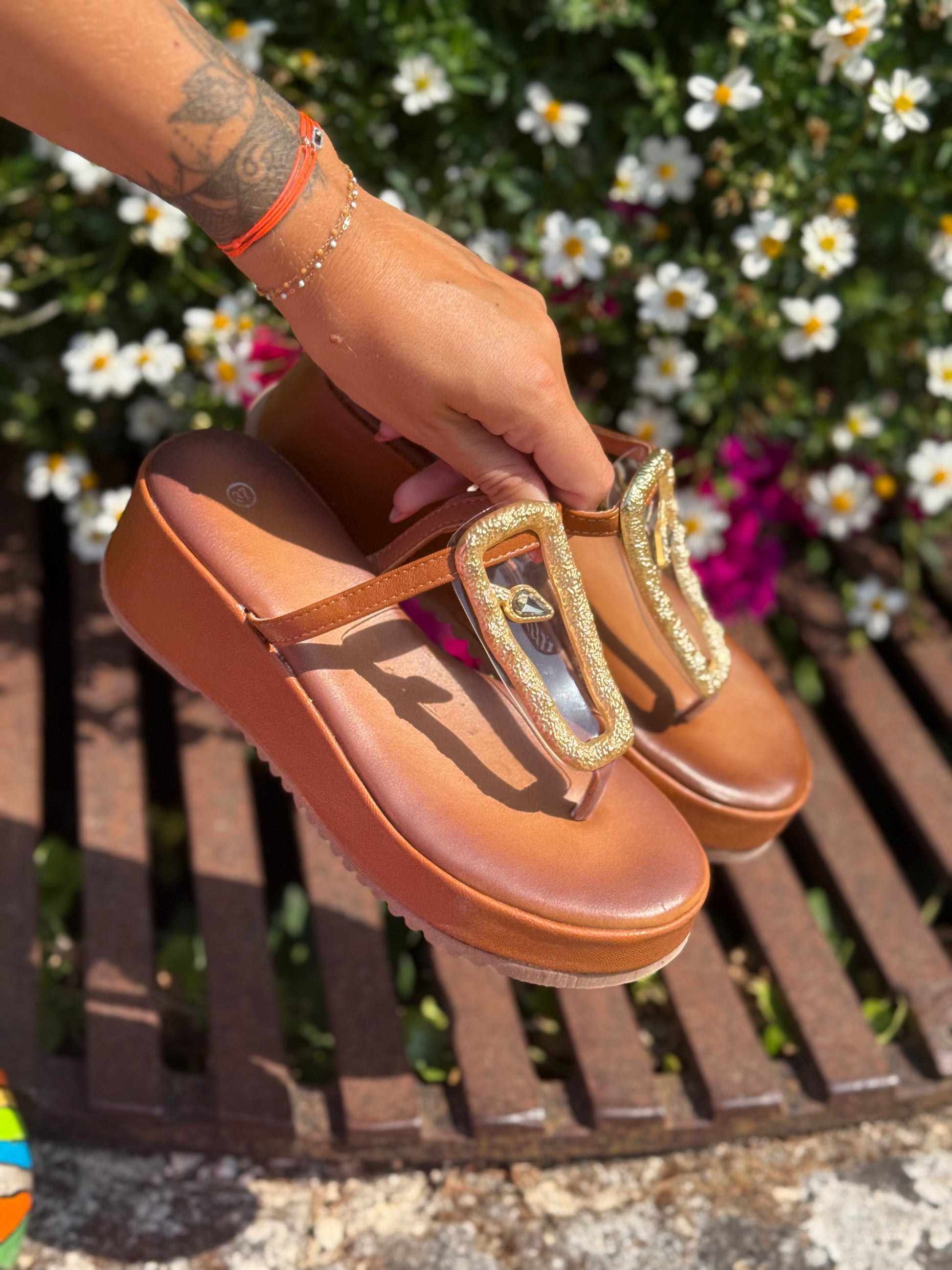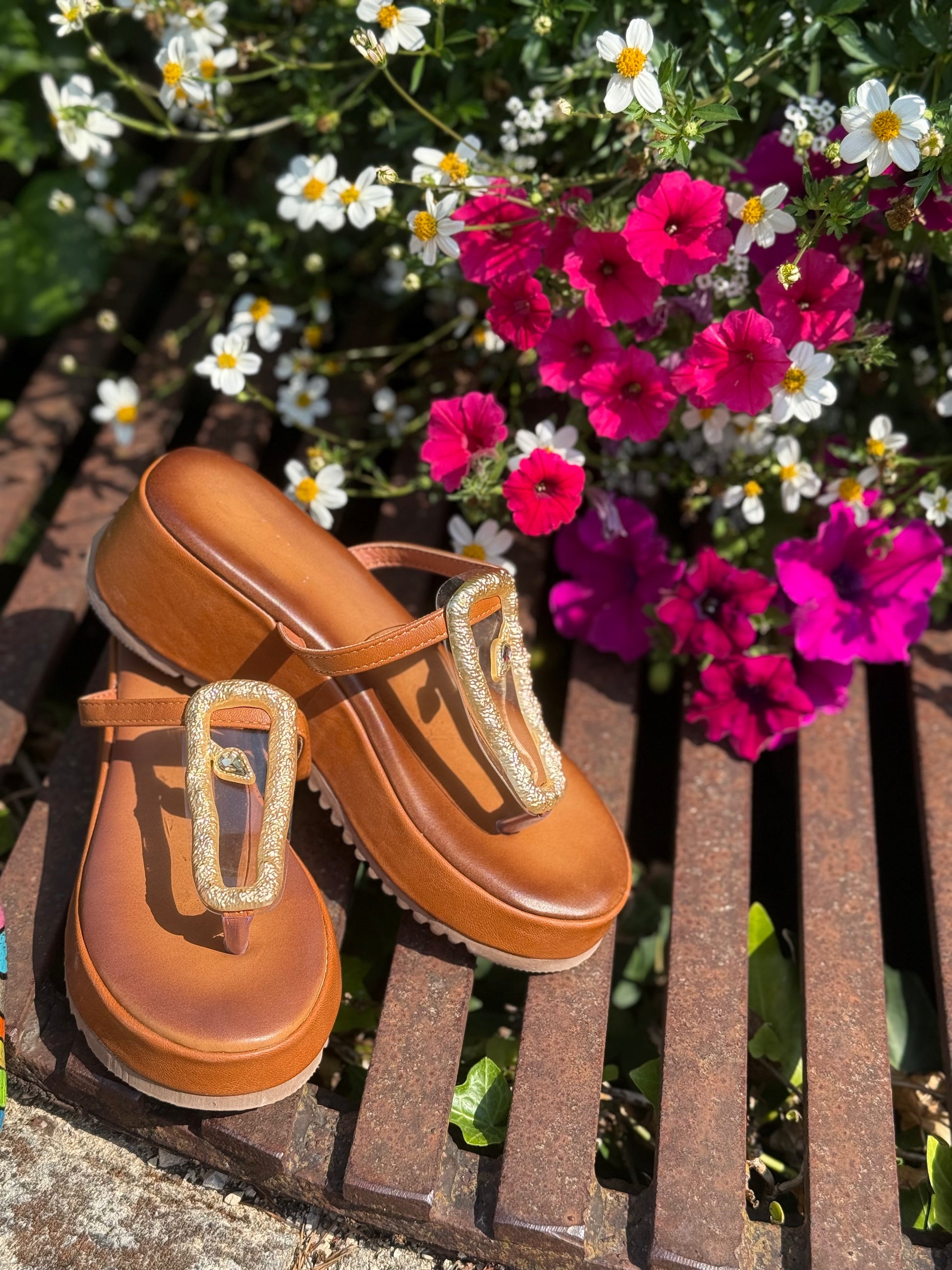 Alyna sont de magnifiques sandales marrons avec un bijou doré sur le dessus du pied qui apportera un coté féminin à la chaussure.