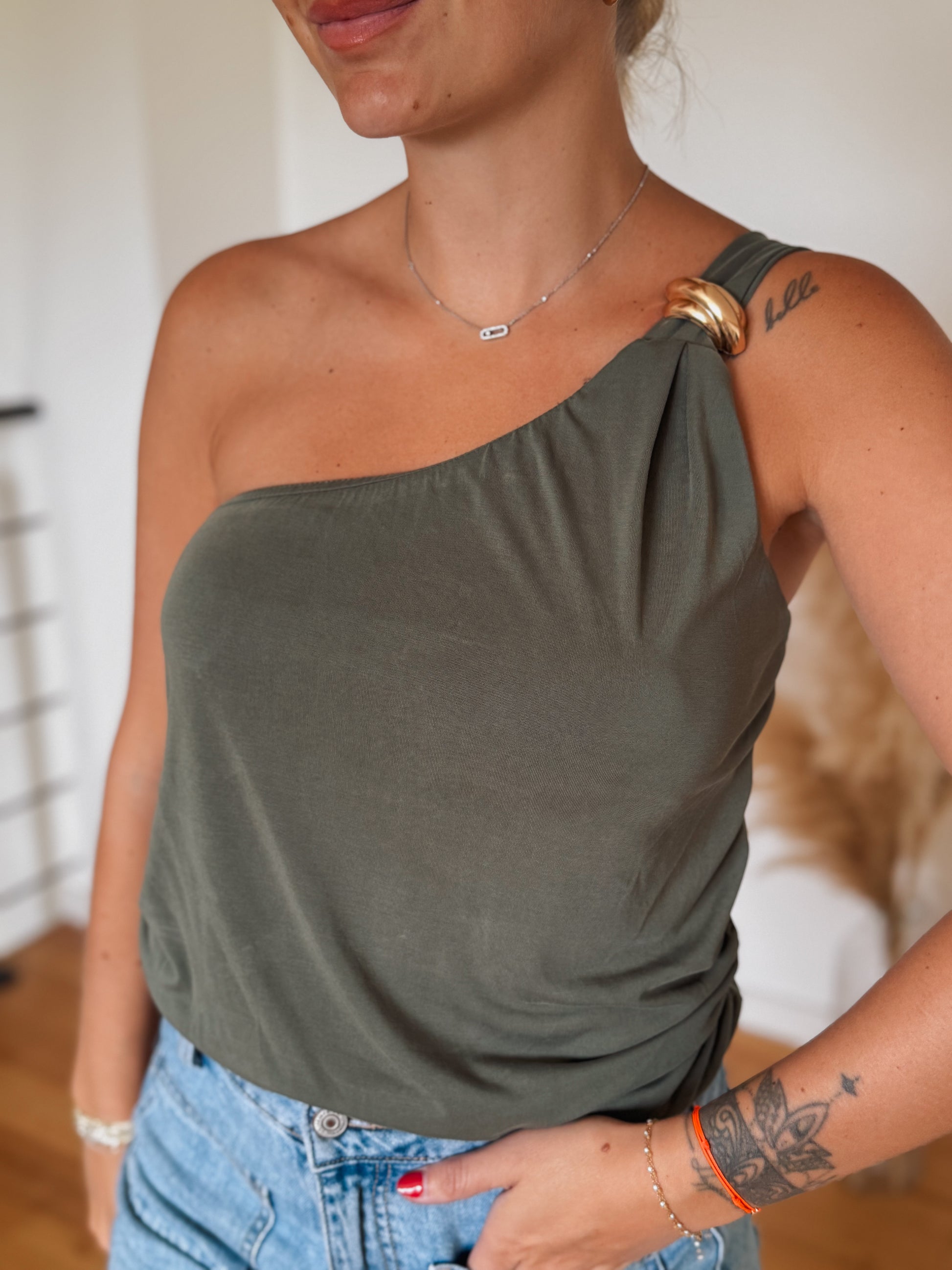 Aly est un top asymétrique doté d'un bijou doré sur l'épaule pour apporter un coté féminin à la tenue. Sa matière est douce et très agréable.