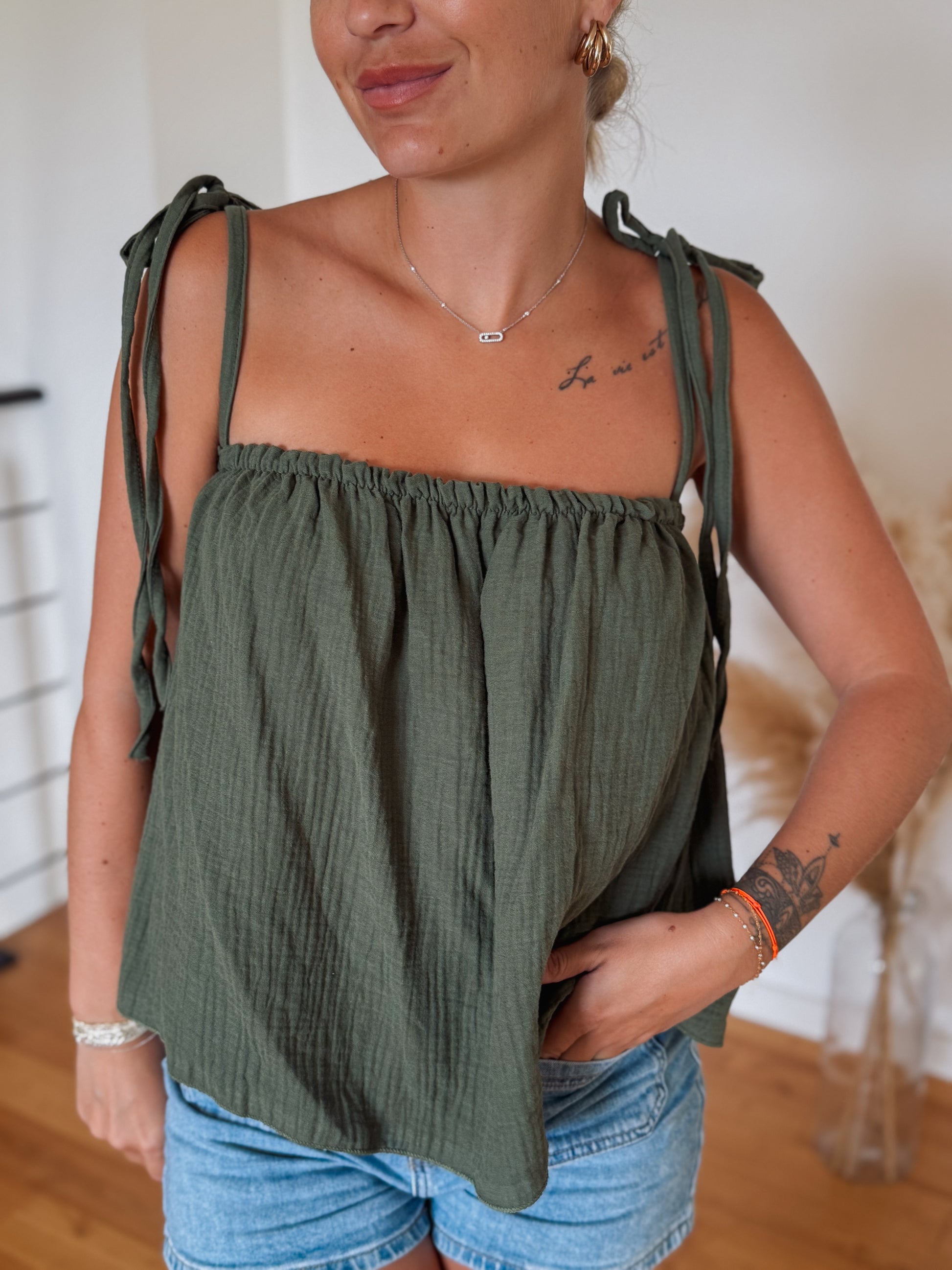 Le top Amo est une top très "cool" et détente pour cet été. Son coloris kaki se voudra tendance. ses bretelles sont ajustables et d'adaptes à différents gabarits.