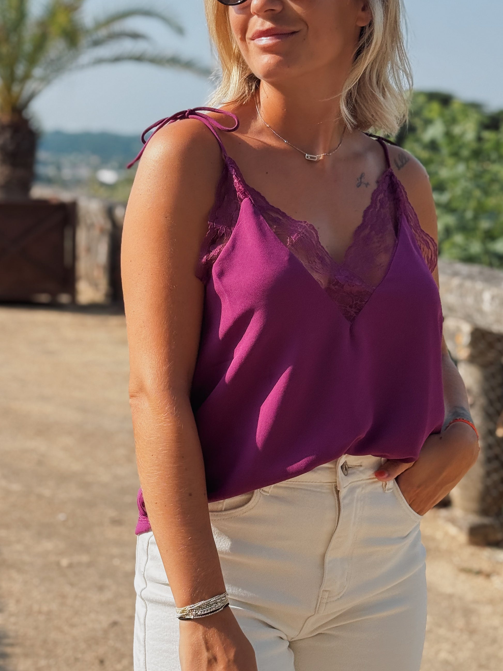 Loly est un magnifique top violet très élégant et féminin grâce à sa dentelle présente au niveau du col. Les bretelles se nouent pour convenir à tous types de morphologies.